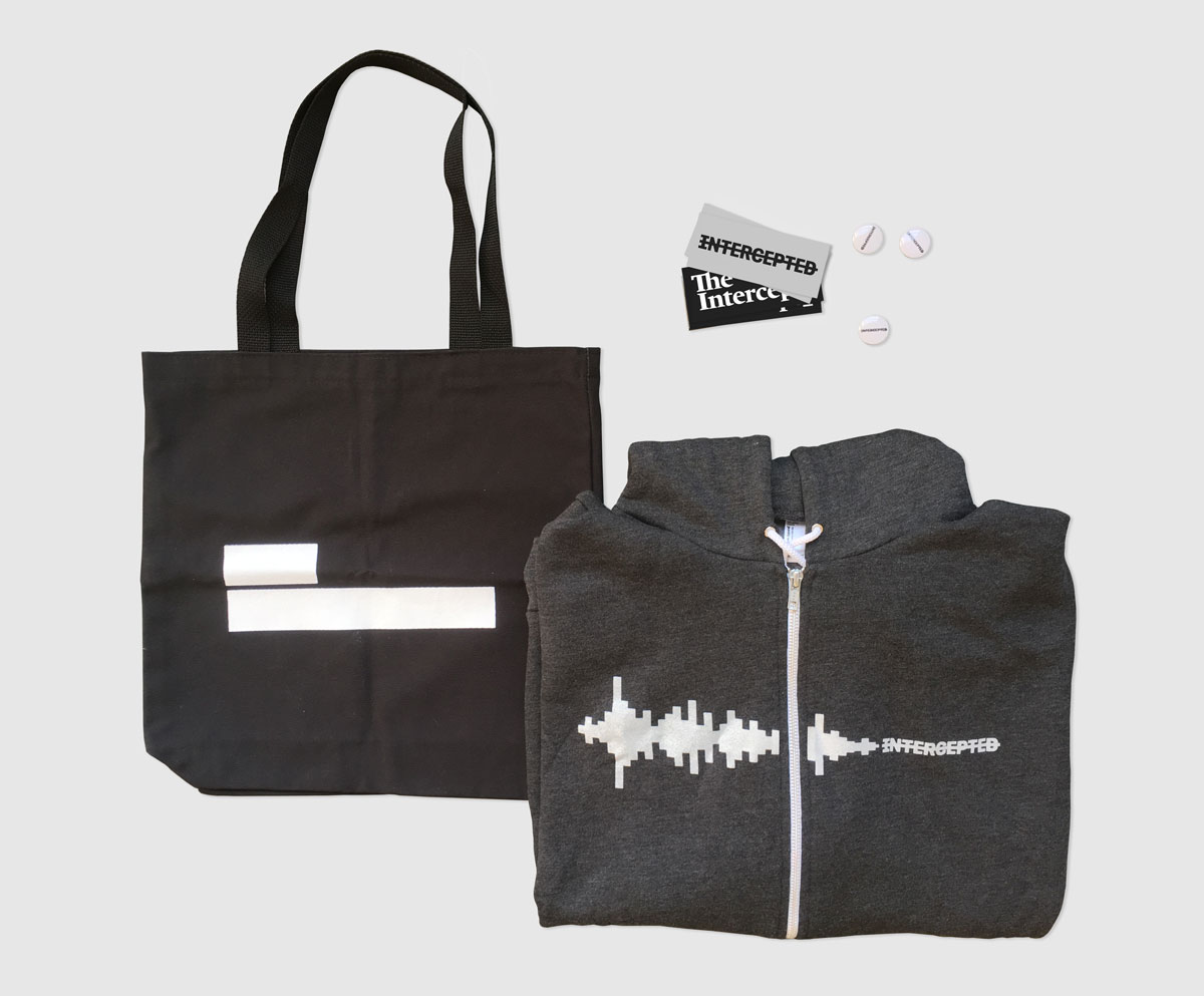 Branded tote bag, hoodie, pins and stickers for The Intercept and Intercepted podcast.